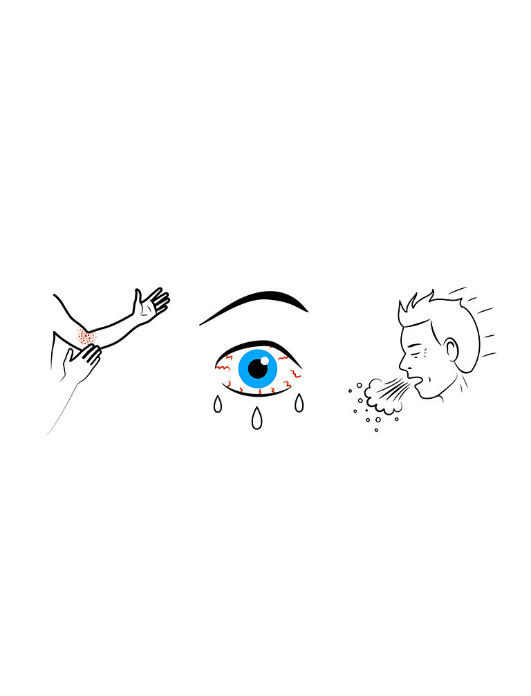 Wenn Sie jedoch mit Substanzen in den oben genannten Produkten in Kontakt kommen und sich herausstellt, dass Sie allergisch darauf reagieren, können Symptome in Bezug auf Haut (zum Beispiel rote, juckende Haut oder allergisches Ekzem), Nase (zum Beispiel niesen, laufende Nase oder juckende Nase) oder Augen (zum Beispiel juckende oder wässerige Augen) auftreten.