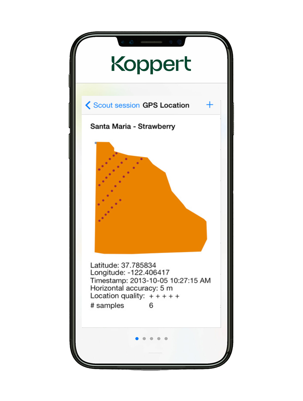 Koppert Biological Systems, Inc. hat Koppert iPM entwickelt, eine einzigartige Scouting-Softwareanwendung, die die Landwirte bei ihrem Pflanzenschutzprogramm unterstützt. Koppert iPM besteht aus zwei Komponenten, einer Scout-App und einem Online-Dashboard. Die Scout-App funktioniert über GPS und verfügt über eine intuitive Benutzeroberfläche. Das Dashboard vermittelt dem Erzeuger nach dem Hochladen auf dem Feld nahezu in Echtzeit einen Einblick in Schädlingsprobleme. Koppert iPM Scouting-Software trägt zur Senkung der Ausgaben für Pflanzenschutzmittel bei, weil der hochgenaue Einblick in die Wirksamkeit der Pflanzenschutzmittel und der optimierte Zeitpunkt von biologischen Anwendungen die Wirksamkeit der Pflanzenschutzmaßnahmen erhöhen. Dadurch wird es möglich, den Einsatz der Pflanzenschutzmittel zu verringern und gleichzeitig sowohl die Pflanzengesundheit als auch den Ertrag zu steigern.