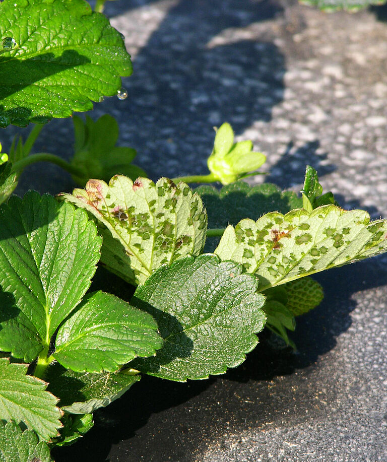 Xanthomonas fragariae verursacht zunächst kleine, wässrige Flecken an der Unterseite des Blattes. Diese Läsionen vergrößern sich zu eckigen Flecken, die oft durch feinste Blattnerven begrenzt werden. Eine Besonderheit ist, das die Blattschäden bei verschiedenen Lichtquellen unterschiedlich aussehen: Unter reflektiertem Licht erscheinen die Flecken dunkelgrün, im durchscheinenden Licht sind sie transparent. Bei feuchten Bedingungen bildet sich an der Unterseite des Blattes ein zähflüssiger Bakterienschleim. Wenn sie trocknet, verwandelt sich diese Ausscheidung in einen weißen Film. Die Läsionen können im Laufe des Wachstums ineinanderfließen und später auch auf der Blattoberseite als unregelmäßige Flecken sichtbar werden. Sie sind zunächst rötlich-braun, später nekrotisch. Blattschäden sind am häufigsten, aber auch alle Arten von Gefäßgewebe der Krone können infiziert werden, sodass die Sympotme einer Phytophthora fragariae-Infektion ähneln.