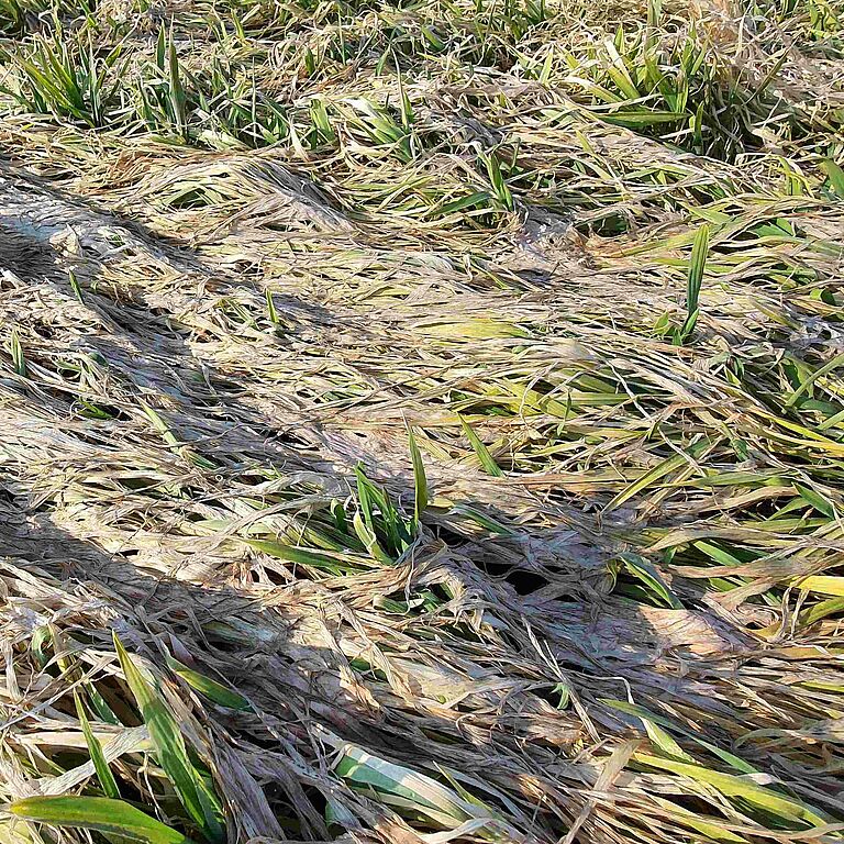 Die Fußfäule wird ab dem späten Stängelwachstum deutlich. Sie führt zu einer dunkelbraunen Verfärbung der unteren Knoten. Auch an der Stammbasis können lange dunkle Streifen erscheinen. Bei älteren Pflanzen kann die Infektion zu einer echten Fußfäule führen, bei der die Stängelbasis braun und faul wird, was zu Lagerbildung und Whiteheads führt. Dieses Symptom ist weniger häufig, kann aber in sehr trockenen Jahreszeiten auftreten.