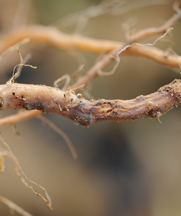Die Erkrankung beschränkt sich normalerweise auf einige wenige Wurzeln, in schweren Fällen können jedoch alle Wurzeln betroffen sein. Im Endstadium der Erkrankung bleibt nur noch Gefäßgewebe übrig, weil die Rinde (äußere Schicht) verfault ist. Infektionen im Frühstadium der Pflanzen führen zu einem verkümmerten Wachstum und kleineren Blättern von intensiv grüner Farbe. Kommt es in diesem Stadium zu einer schweren Infektion, so können die Pflanzen absterben. Wenn die Infektion weniger schwer ist, können die Triebe in einem späten Stadium der Pflanze welken. Ist die Wasserversorgung im früheren Entwicklungsstadium mit hoher Verdunstung jedoch in irgendeiner Weise eingeschränkt, kann es zu einer vorzeitigen Welke kommen. Bei verwelkten Pflanzen sieht die Krone zunächst wässrig aus, wird hellbraun und sinkt ein. Später färbt sie sich schwarz und es zeigen sich bernsteinfarbene Sporenausscheidungen. Im Anfangsstadium der Welke ist es schwierig, dieses Schadbild von anderen Welkekrankheiten zu unterscheiden.