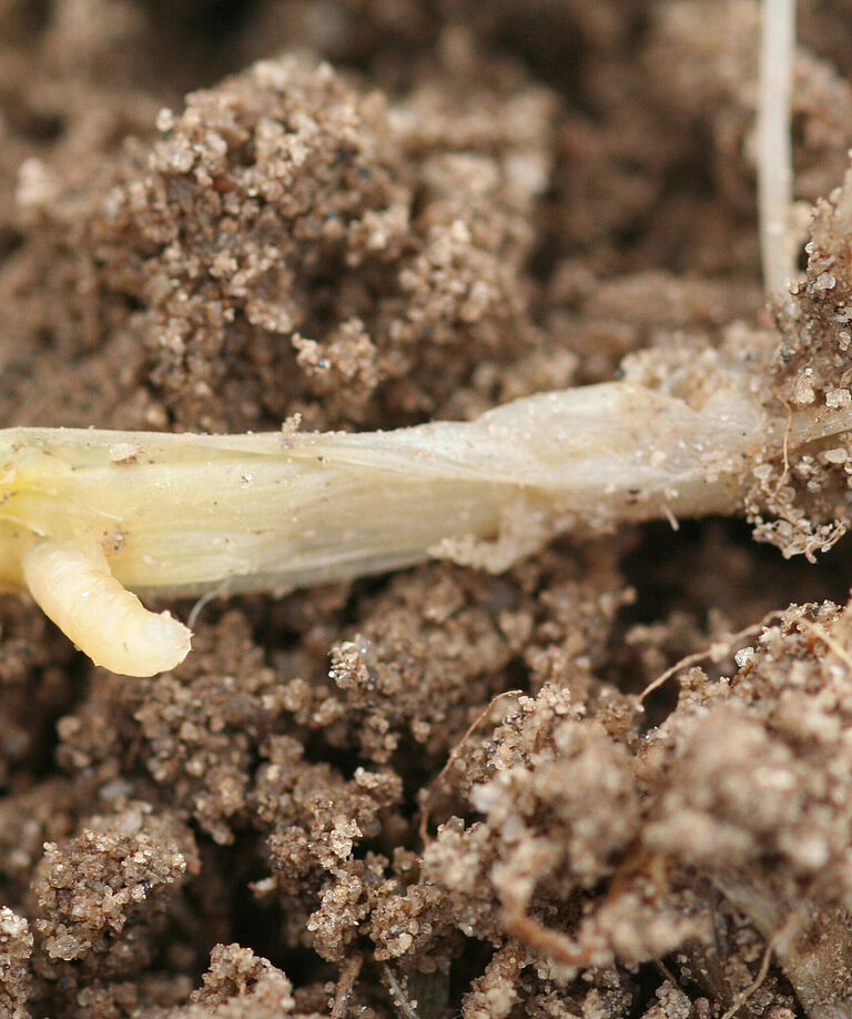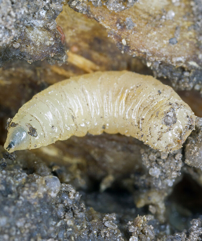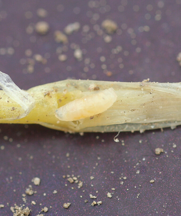 - Vorhandensein von Larven: Kleine, weiße Maden in der Nähe der Basis der befallenen Bohnenpflanzen. Diese Larven sind ein deutlicher Hinweis auf einen Befall mit der Bohnenfliege.