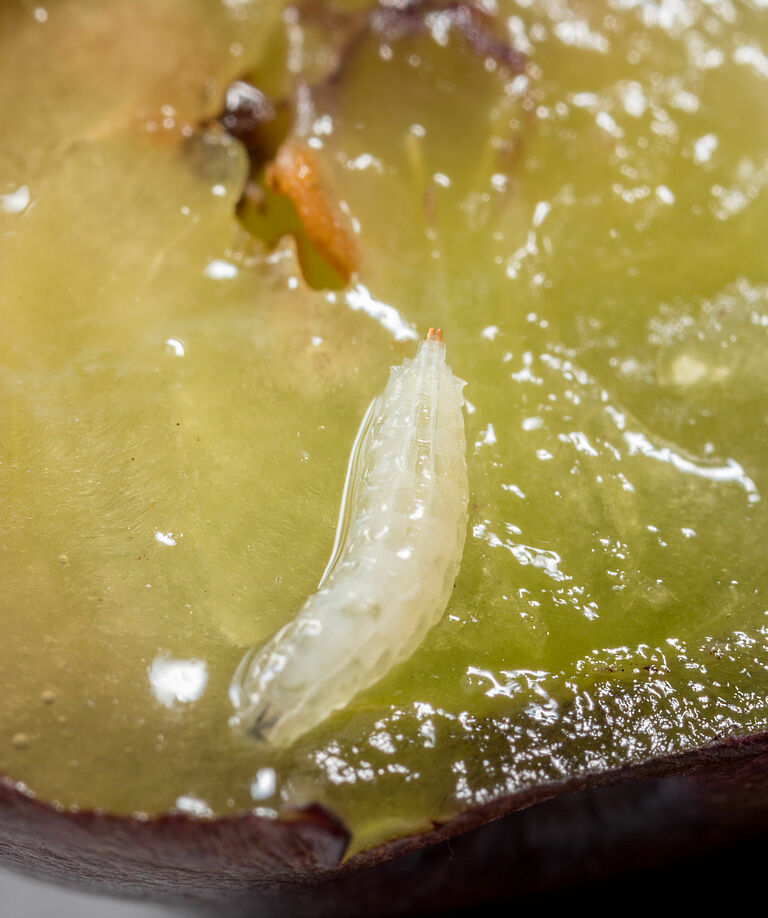 Die Weibchen legen ihre Eier in unreife Früchte, bevorzugt von weichfleischigem Obst. Jedes Ei hat zwei Atmungsröhren, die aus der Frucht herausragen, mit bloßem Auge aber schwer erkennbar sind. Die Larven ernähren sich von der Frucht, sodass das Fruchtgewebe einfällt und weiche Flecken entstehen. Selbst wenn die Früchte nicht faulen, sind sie aufgrund der enthaltenen Larven unverkäuflich. Die bei der Eiablage von D. suzukii entstandenen Einstiche können von sekundären Pathogenen (z. B. Bakterien, Pilzen und Hefen) befallen werden und die Fäulnis der ganzen Frucht noch beschleunigen. Bei beschädigten Früchten ist die Wahrscheinlichkeit höher, dass sie auch von anderen Drosophila-Arten befallen werden. D. suzukii hat ein breites Wirtsspektrum, wobei Beeren mit dünner Fruchthaut (z. B. Himbeeren, Brombeeren, Heidelbeeren, Erdbeeren) und Steinobst (z. B. Kirschen, Pflaumen) besonders anfällig für einen Befall sind.