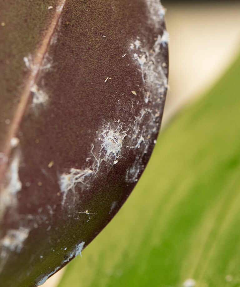 - Nymphen und Weibchen entziehen Pflanzensaft, sodass die Pflanze im Wachstum kümmert, sich die Blätter verformen, gelb färben oder sogar abfallen. Insgesamt wird die Photosynthese beeinträchtigt und dadurch der Ertrag reduziert. Blüten und Früchte fallen oft ab.