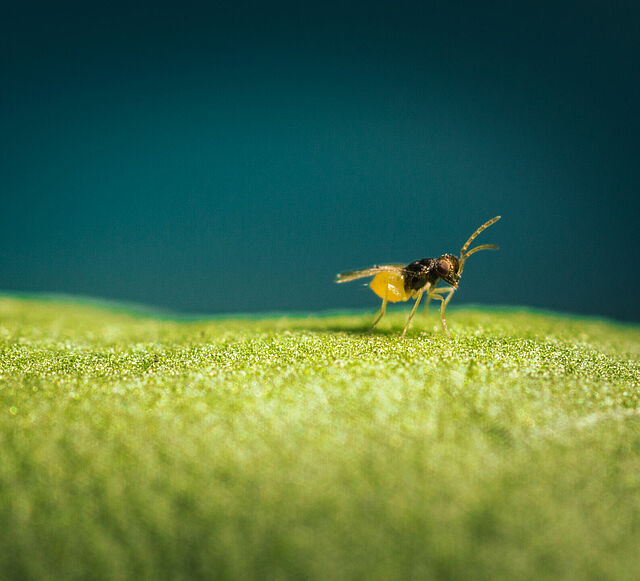 Encarsia formosa ist eine parasitische Wespe, die für ihre Wirksamkeit bei der Bekämpfung der Weißen Fliege, insbesondere der Gewächshaus-Weißen Fliege(Trialeurodes vaporariorum), bekannt ist. Das Wespenweibchen legt ihre Eier in den Nymphen der Weißen Fliege ab, die dann von den sich entwickelnden Larven von innen heraus aufgefressen werden. Die Larven ernähren sich von den inneren Geweben des Wirts, was zu dessen Tod führt und somit zur Verringerung der Zahl der Weißen Fliegen beiträgt. Encarsia formosa ist äußerst anpassungsfähig und kann ihren Parasitismus an die Dichte der Weißen Fliege anpassen, was sie zu einem wertvollen Instrument der integrierten Schädlingsbekämpfung macht. Die Wespen selbst ernähren sich nicht von Weißen Fliegen, sondern sind auf Nektar und Honigtau angewiesen, die von anderen Insekten produziert werden. Ihre Anwesenheit in Gewächshäusern und anderen kontrollierten Umgebungen trägt dazu bei, das Gleichgewicht zu erhalten und die Abhängigkeit von chemischen Pestiziden zu verringern.