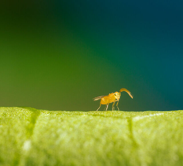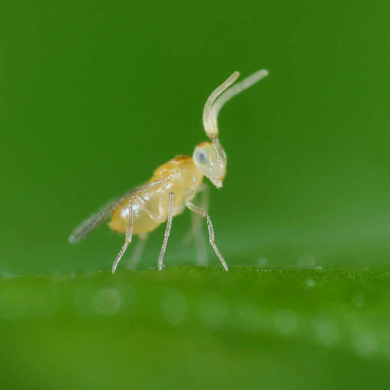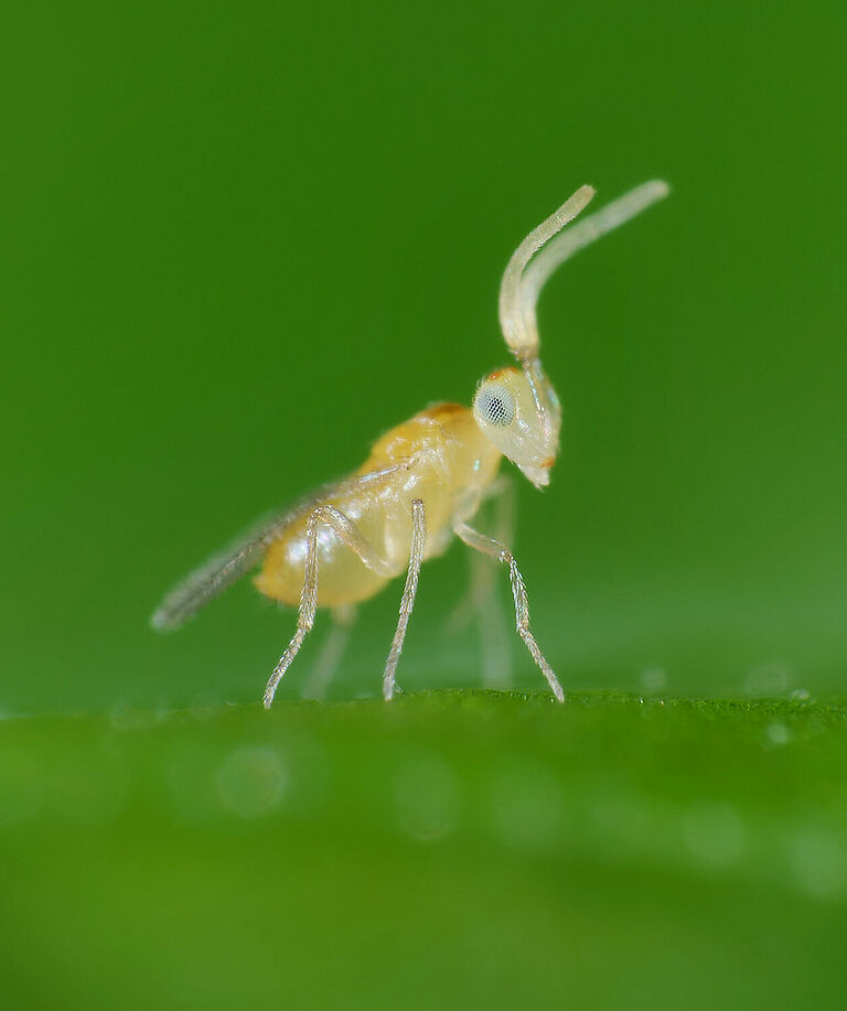 Die parasitische Wespe Eretmocerus eremicus ist bei Koppert als Ercal erhältlich.