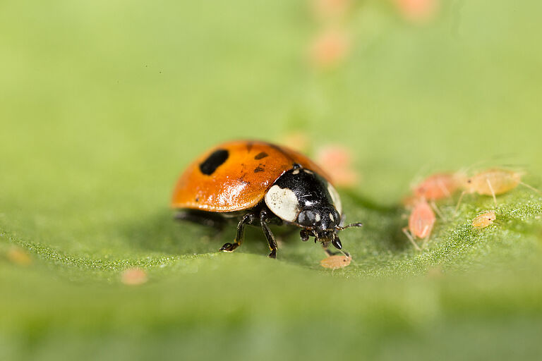 Raubkäfer, einschließlich Marienkäfer, sind eine Gruppe von Nützlingen, die für ihre Rolle bei der natürlichen Schädlingsbekämpfung bekannt sind. Marienkäfer bekämpfen Blattläuse durch ihr natürliches räuberisches Verhalten. Marienkäfer nutzen ihren ausgeprägten Geruchssinn, um Gebiete mit Blattlausbefall zu lokalisieren. Sobald sie Blattläuse gefunden haben, nutzen Marienkäfer ihre spezialisierten Mundwerkzeuge, um sie zu verzehren. Marienkäfer sind als äußerst effiziente Räuber bekannt, die in der Lage sind, in kurzer Zeit eine große Anzahl von Blattläusen zu vertilgen. Aphidalia, die Marienkäferart Adalia bipunctata, ist eine gute Lösung zur Bekämpfung von Blattläusen.