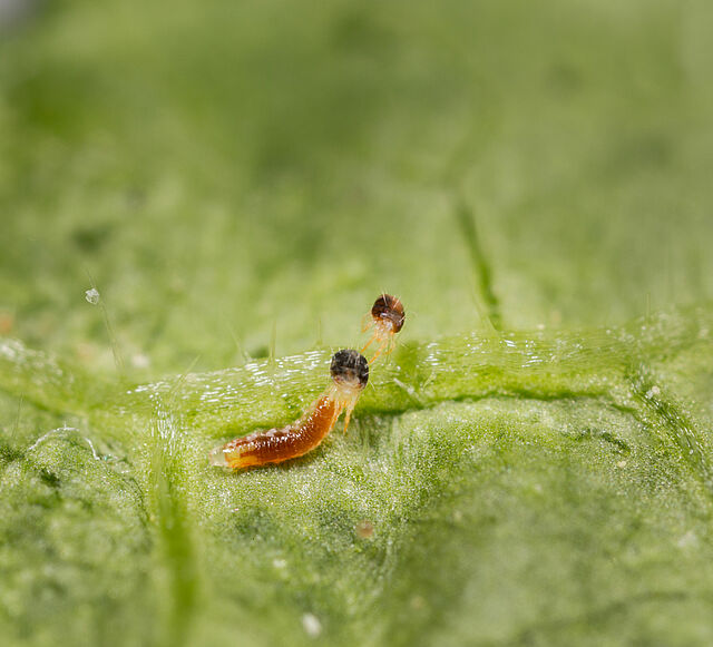 Larvenstadium: Die Farbe der Larve ist in der Regel orange, kann aber je nach der Farbe der gefressenen Beute variieren und manchmal auch gelb oder rot sein. Unmittelbar nach dem Schlüpfen aus dem Ei ist die Larve gelblich-weiß. Die Eier und die ersten Larvenstadien sind aufgrund ihrer geringen Größe und Farbe in den kulturpflanzen nur sehr schwer zu finden.