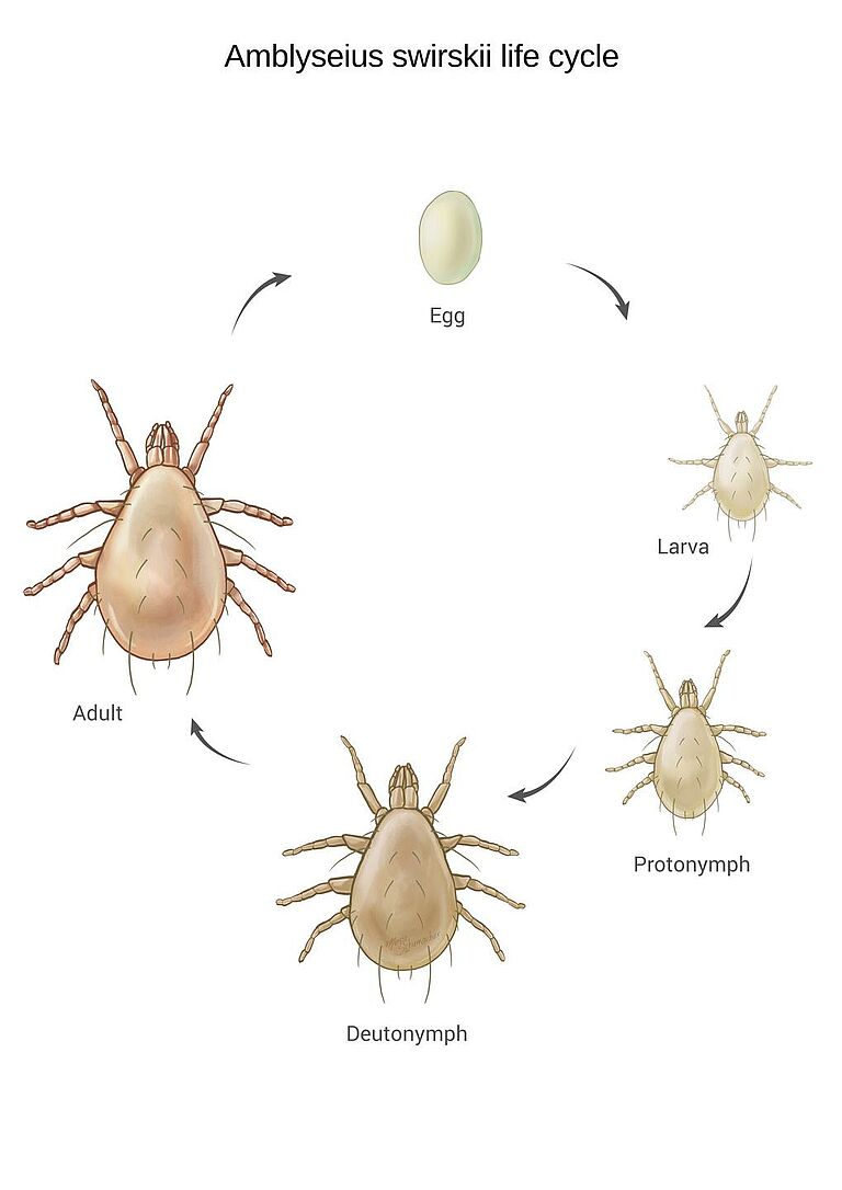 Der Lebenszyklus der Raubmilben besteht aus fünf Entwicklungsstadien: Ei, Larve, Protonymphe, Deuteronymphe und Adult. Raubmilben legen ihre Eier in der Nähe von Schädlingen/Schädlingskolonien ab. Die Larven haben drei Beinpaare. Je nach Raubmilbenart sind die Larven aktiv oder inaktiv. Sobald sich die Larve in das Protonymphenstadium (mit vier Beinpaaren) gehäutet hat, beginnt sie sofort mit der Nahrungsaufnahme. Während des Protonymphen-, Deuteronymphen- und Erwachsenenstadiums fressen die Milben fast ununterbrochen. Protonymphen und Deuteronymphen ähneln im Erscheinungsbild den adulten Tieren, sind aber kleiner.